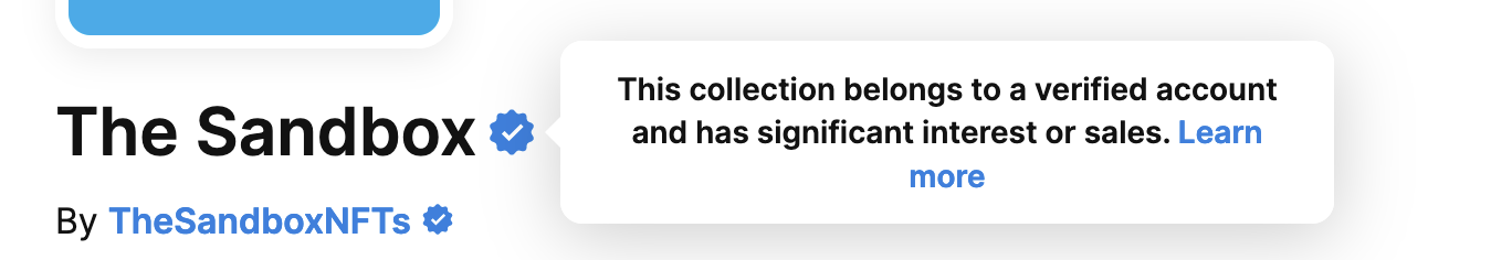 * Make sure there is a blue verified checkmark at the top of the page. And that the collection name, **The Sandbox**, is written correctly.
