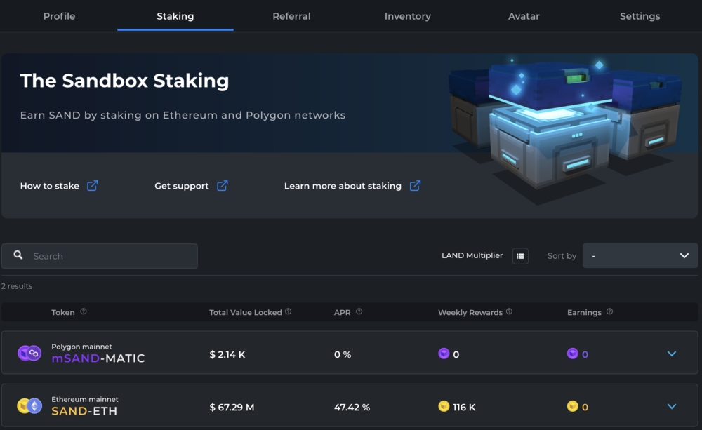 You will find the staking farms and their information in your profile at The Sandbox, under the Staking tab.
