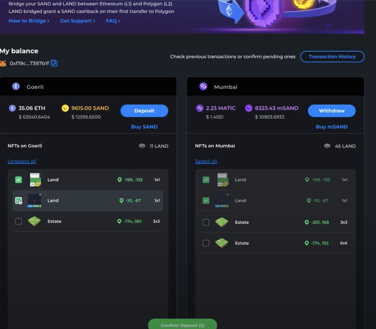 Instructions to deposit LAND from the Ethereum to Polygon network.