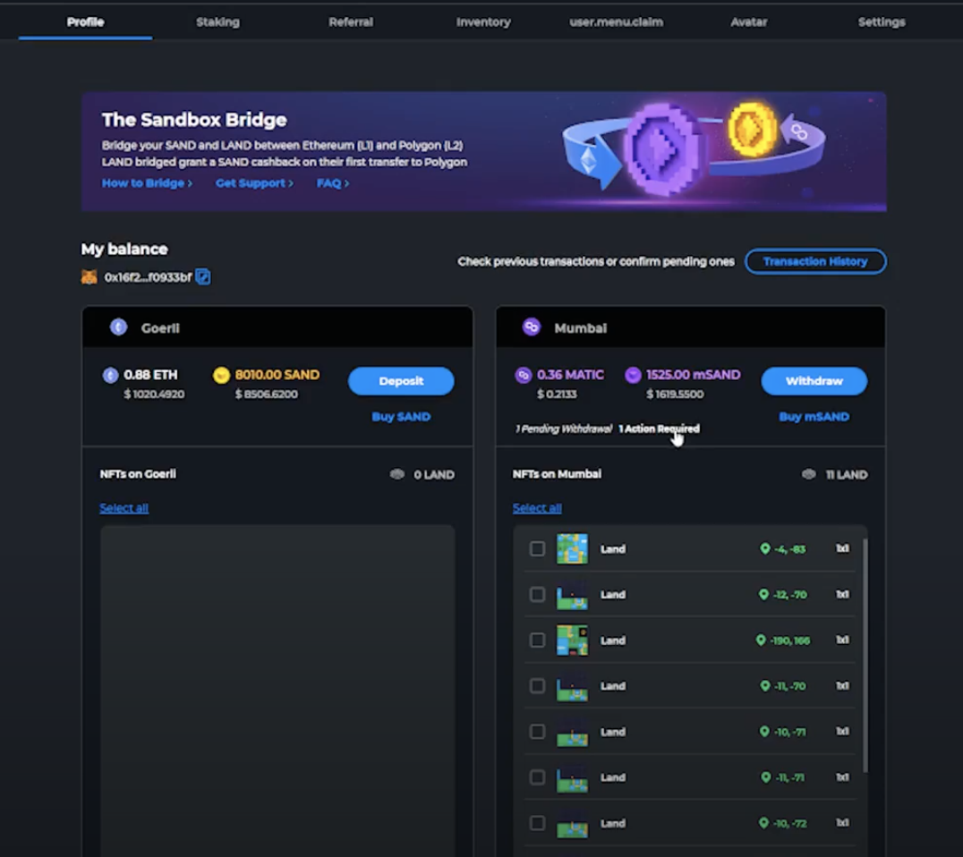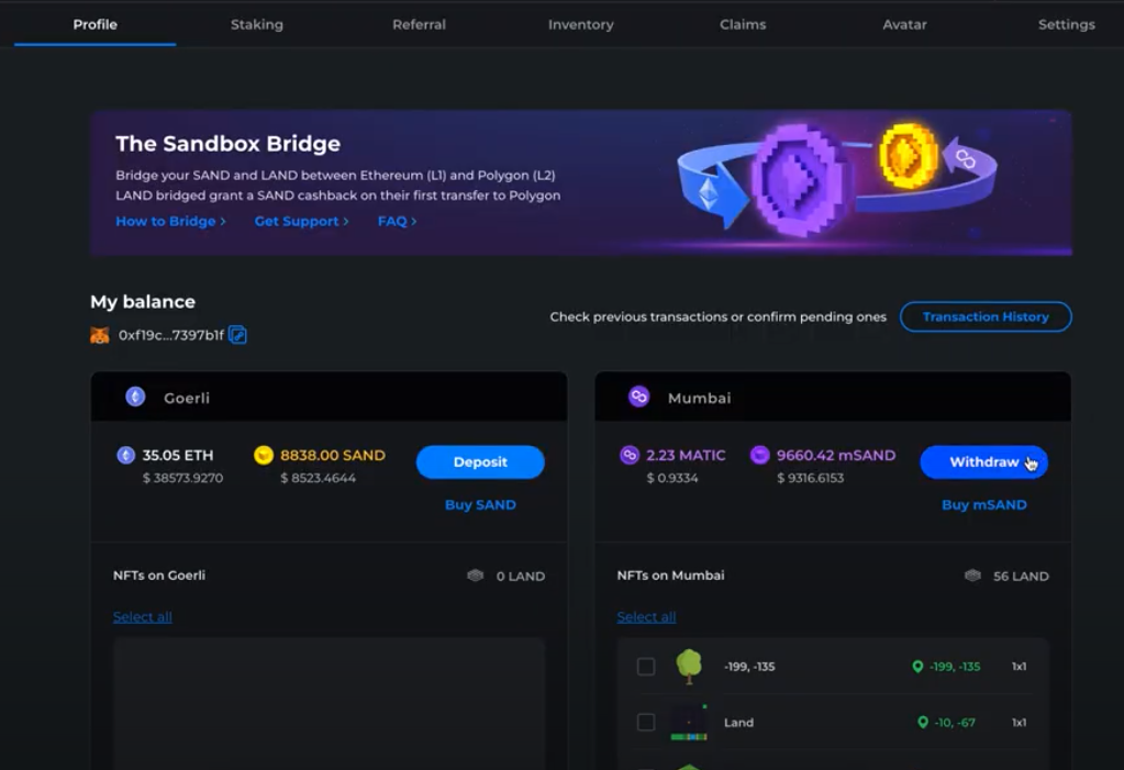 Log in to your account and access the bridge page on The Sandbox: https://sandbox.game/me/profile.
