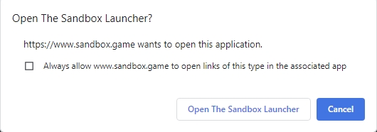 When you press Play to enter an Experience, you will be prompted to open The Sandbox Launcher. Click the checkbox in the prompt window to allow play links to automatically open the Launcher.