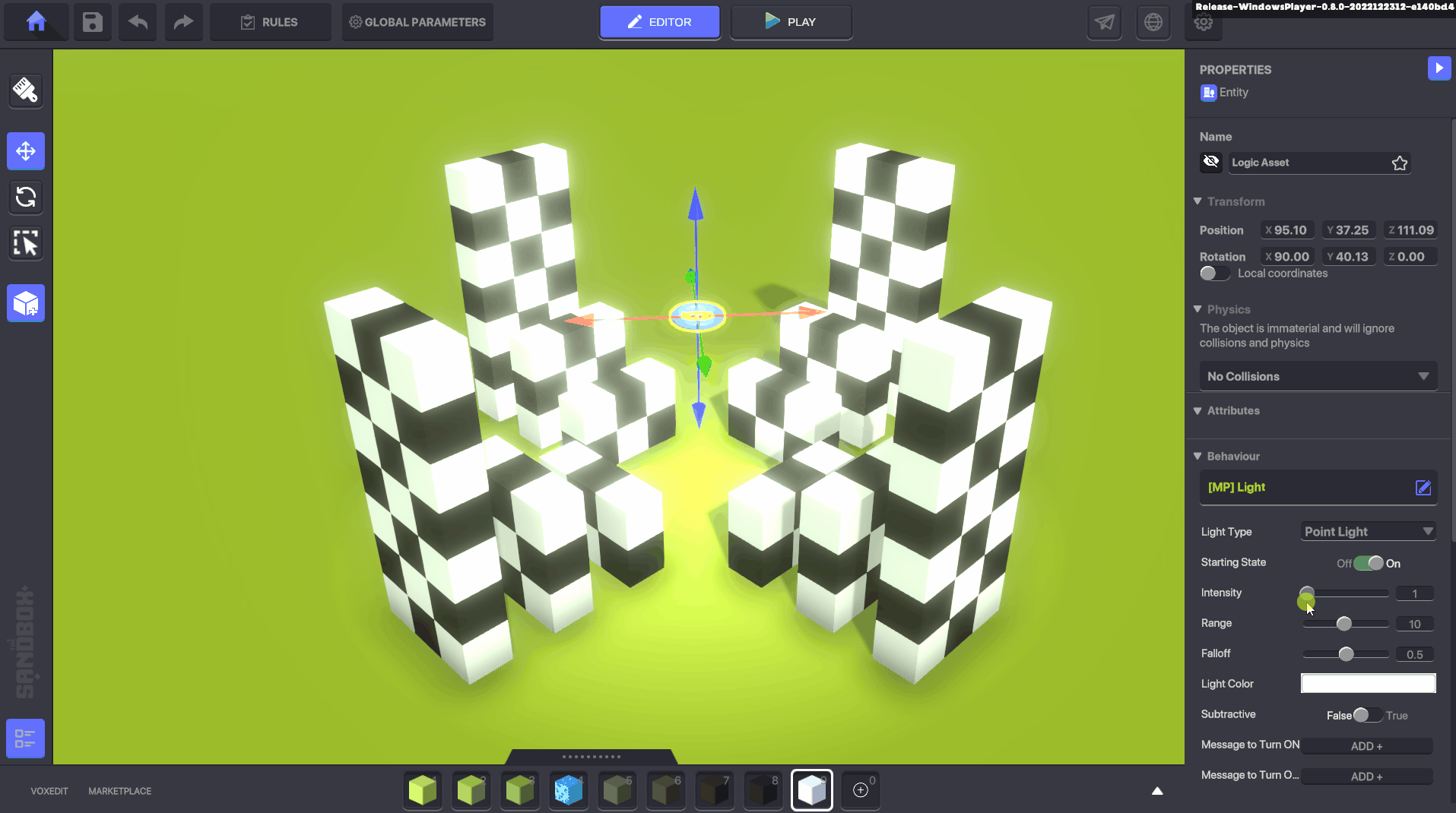 The Subtractive Light still uses the same variables as the standard light, with a key difference that increasing Intensity will more aggressively remove light within the defined range.