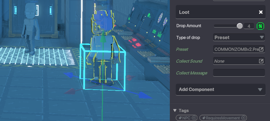 좀비로 변하게 하고 싶은 애셋을 선택합니다. ‘Loot component’를 추가합니다.
