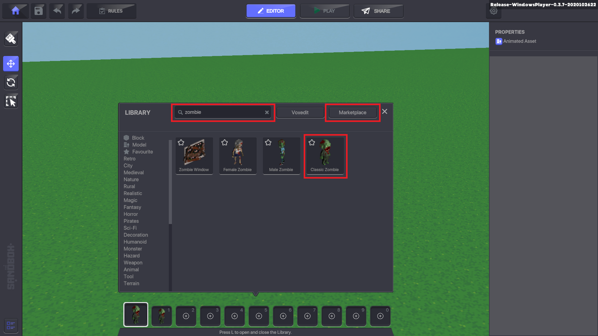 우선, 생성하고 싶은 좀비를 배치합니다. L 키를 눌러 라이브러리를 오픈하고 'zombie'를 검색합니다. 만약 좀비를 찾지 못하더라도 걱정하지 마세요. 마켓플레이스에 다른 애셋들과 함께 업로드되어 있을 테니까요.