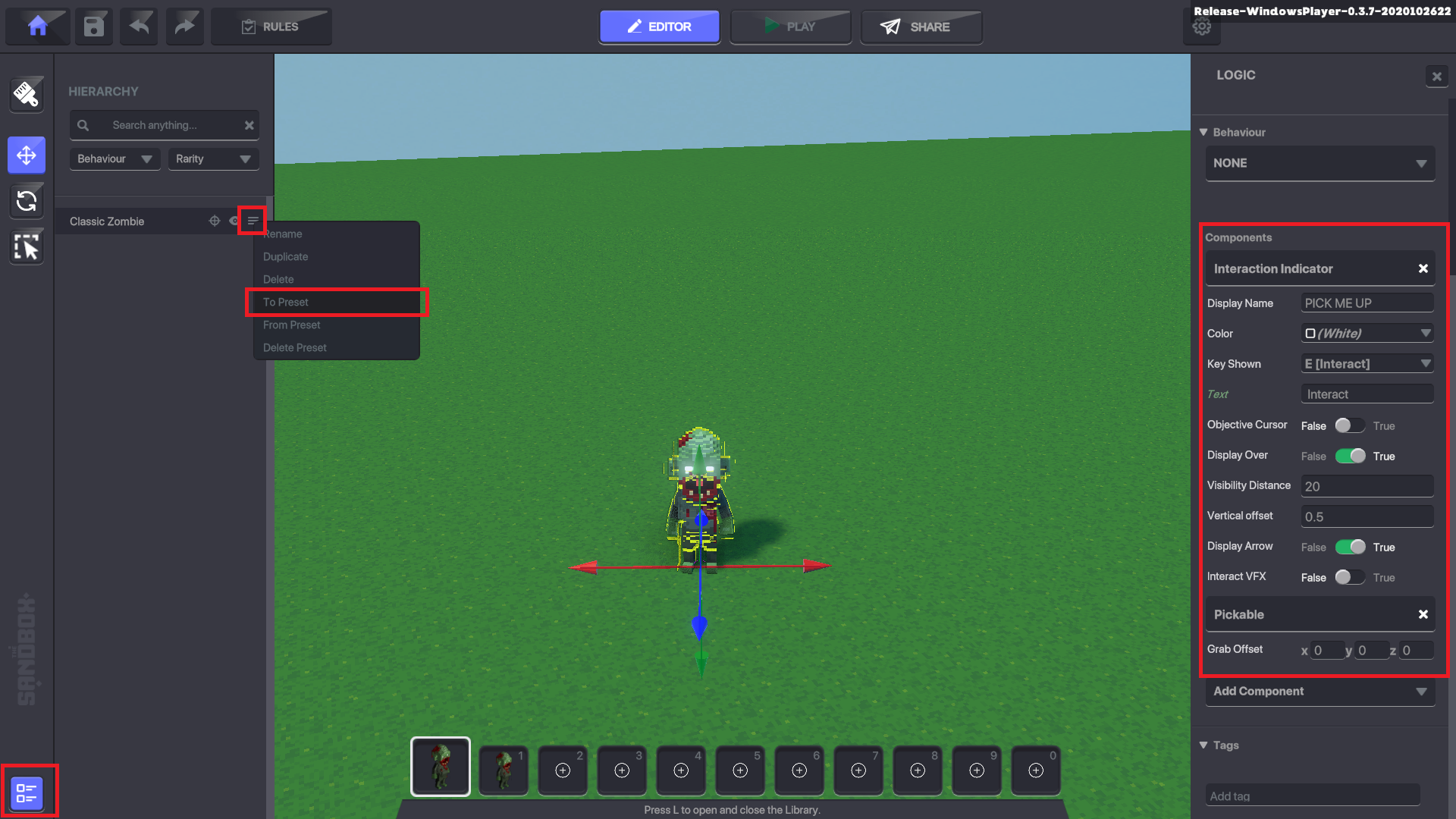 좀비에게 부여하고 싶은 ‘Behaviour’와 ‘Components’를 추가합니다. 이 예시에서는 ‘Indicator' 컴포넌트를 추가하여 플레이어에게 ‘PICK ME UP’이라는 메시지를 표시하게 합니다.