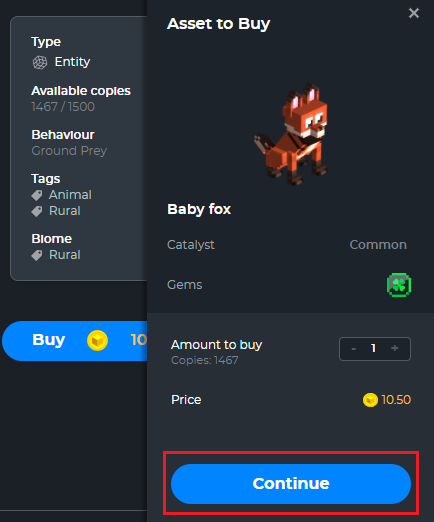 페이지 오른편에 사이드바가 표시됩니다. 이 사이드바를 이용하여 몇 개의 NFT 에디션을 구매할지 선택한 후 파란색 Continue (계속) 버튼을 클릭합니다.