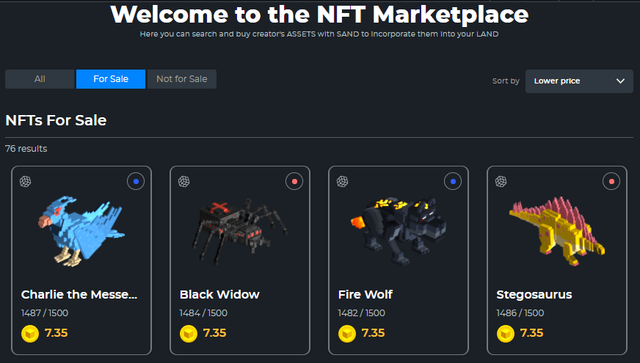 마켓플레이스에서 원하는 NFT를 검색할 수 있습니다. 검색창과 몇 가지 필터를 이용하여 더 자세한 검색이 가능합니다. $SAND로 책정된 NFT 가격은 노란색으로 표시되어 있습니다.